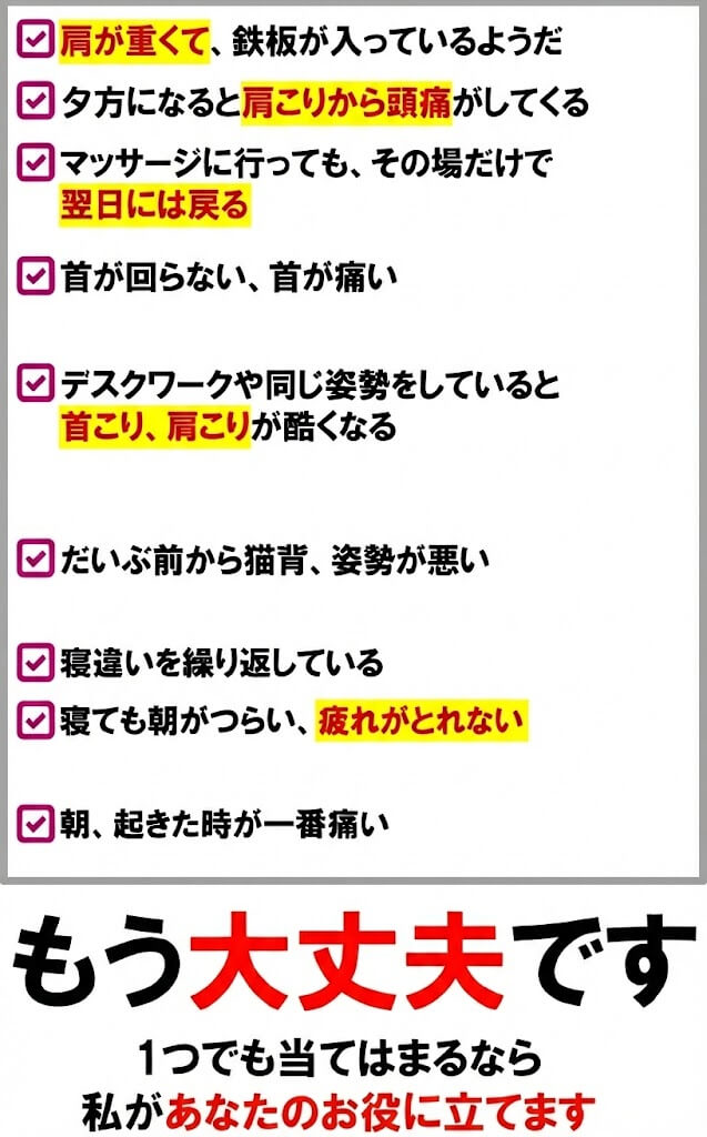 もうこの肩こり・首痛をなんとしてでも改善したい!本気で治したい!