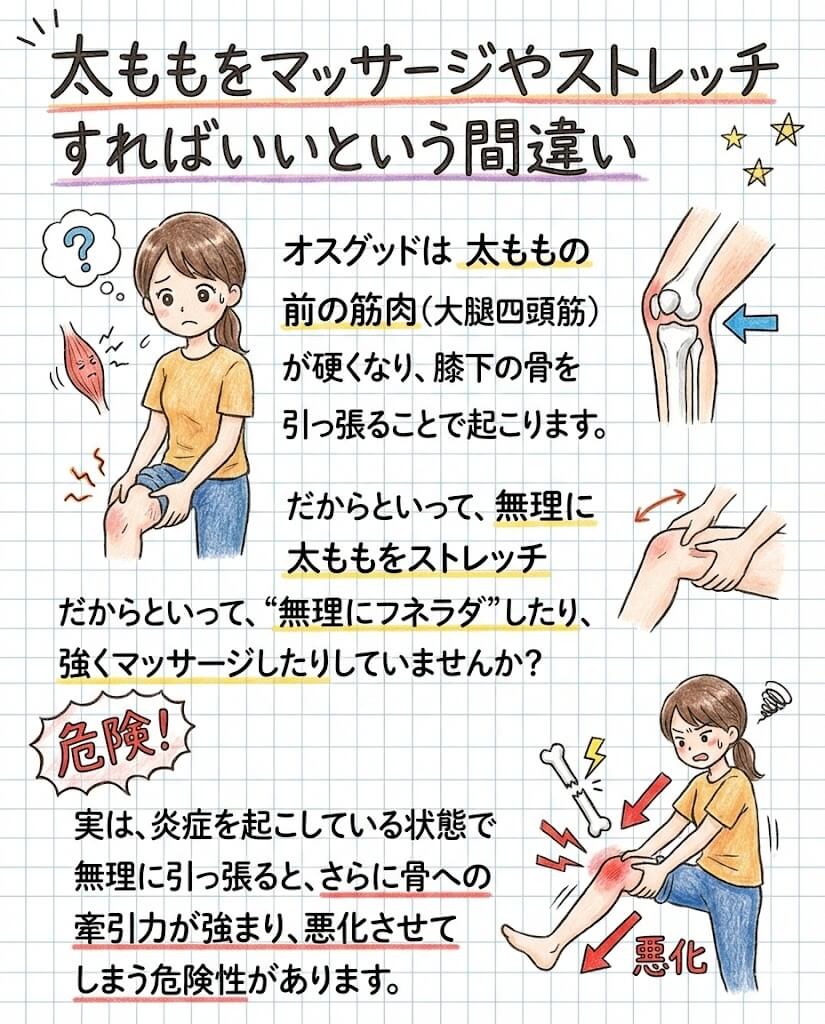 オスグッドは太ももの前の筋肉(大腿四頭筋)が硬くなり、膝下の骨を引っ張ることで起こります。だからといって、無理に太ももをストレッチしたり、強くマッサージしたりしていませんか? 実は、炎症を起こしている状態で無理に引っ張ると、さらに骨への牽引力が強まり、悪化させてしまう危険性があります。