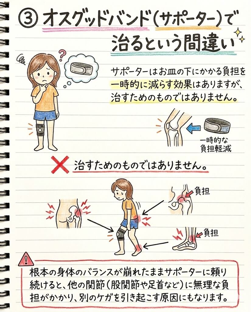 サポーターはお皿の下にかかる負担を一時的に減らす効果はありますが、治すためのものではありません。根本の身体のバランスが崩れたままサポーターに頼り続けると、他の関節(股関節や足首など)に無理な負担がかかり、別のケガを引き起こす原因にもなります。
