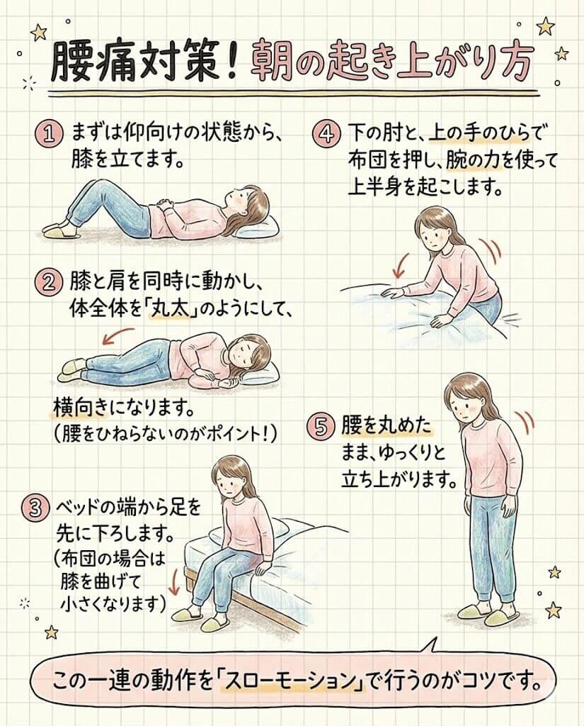 寝る姿勢が決まってもトイレに行く時や朝起きる時に「グキッ!」とやってしまっては元も子もありません。