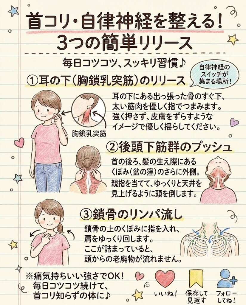 - 耳の下(胸鎖乳突筋)のリリース:耳の下にある出っ張った骨のすぐ下、太い筋肉を優しく指でつまみます。ここは自律神経のスイッチが集まる場所です。強く押さず、皮膚をずらすようなイメージで優しく揺らしてください。